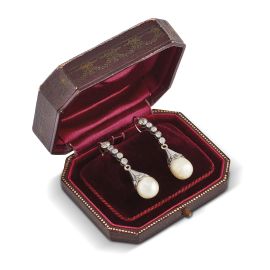 in oro bianco 18kt, impreziositi da una fila di diamanti taglio vecchio e a rosa per ct 0.60 circa, da cui pendono due perle naturali di mm 11.5x10.2x9.2 e di mm 10.1x9.8x9.0, dim. cm 1x4 circa, chiusura a monachella, gr. 7 complessivi. Corredati di scatola e certificato GCS del 7/01/2020 attestante le caratteristiche.