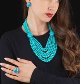 in oro bianco 18kt, composta da una collana torchon a sette fili di sfere in pasta di turchese digradanti da mm 4 a mm 9 circa, con distanziali impreziositi da diamanti taglio brillante e huit huit per ct 1.30 circa, lungh. cm 51; un paio di orecchini in pasta di turchese impreziositi da diamanti taglio brillante per ct 0.70 circa, firmati "Legnazzi", chiusura a clip, accompagnati da un grande anello in pasta di turchese e diamanti per ct 0.50 circa, firmato "Legnazzi", mis. 59, gr. 270 complessivi
