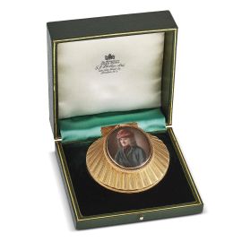 in oro giallo 18kt, lavorata a sbalzo e ad incisione, sulla sommità una miniatura raffigurante un gentiluomo cinto da un serpente e recante all'interno un cuore trafitto da una freccia con una dedica, punzoni francesi, dim. cm 6,5x6, gr. 111. Corredata di scatola.
