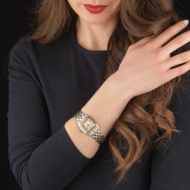 cassa quadrata in acciaio, fondello serrato con viti, lunetta in oro giallo 18kt con viti, corona con pietra cabochon blu, quadrante avorio firmato Cartier, grafica nera, numeri romani stampati, movimento al quarzo, bracciale a maglie in acciaio e oro giallo 18kt, lungh interna cm 18 circa, chiusura doppia deployant firmata Cartier, vetro minerale, gr. complessivi. 64. Dim. mm 27x37. Corredato di scatola.