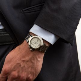 cassa in acciaio, fondello serrato con viti, lunetta liscia in acciaio, copricorona avvitato con catena, quadrante bianco firmato Cartier, grafica nera, numeri arabi in nero e indici applicati color oro, datario tra ore quattro e cinque, movimento a carica automatica, bracciale a maglie piatte in acciaio, chiusura doppia deployant a scomparsa, vetro minerale. Diam. mm 35