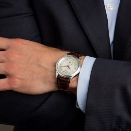 cassa in oro bianco 18kt, fondello serrato con viti con movimento a vista, corona marcata, quadrante argenté con indicazione della riserva di carica a ore dodici e calendario a ore sei, grafrica nera, indici argento applicati, movimento a carica manuale cal 1.98 n. 1000638, cinturino originale in pelle marrone, fibbia originale in oro bianco 18kt, vetro minerale, gr. 86. Diam. mm 37. Corredato di scatola, garanzia e libretti.