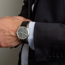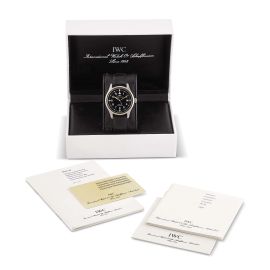 cassa in acciaio, fondello a vite con coperchio antimagnetico, corona marcata, quadrante nero firmato IWC, numeri arabi in bianco e indici al trizio, datario a ore tre, movimento a carica automatica cal C37524 n. 2750196, cinturino in pelle nera, chiusura deployant in acciaio originale, vetro minerale. Diam. mm 38. Corredato di scatola e garanzia.