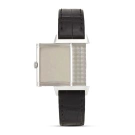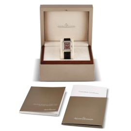 cassa fissa e reversibile in acciaio, ref. 277.8.62, corona marcata, quadrante bordeaux, grafica di colore bianco, indici argento applicati, movimento a carica manuale, cinturino originale in pelle nera, fibbia in acciaio marcata Jaeger LeCoultre, vetro minerale. Dim. mm 27x45. Corredato di scatola, garanzia e libretto. Presente pellicola sul fondello.