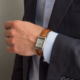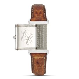 cassa fissa e reversibile in acciaio, fondello recante personalizzazione "E.C.", corona marcata, quadrante argenté firmato Jaeger LeCoultre, grafica di colore nero, numeri arabi stampati, movimento a carica manuale, cinturino in pelle marrone, chiusura deployant in acciaio marcata Jaeger LeCoultre, vetro minerale. Dim. mm 23x40