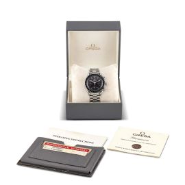 cassa in acciaio, fondello a scatto con logo Speedmaster, tasti a pompa, corona marcata, ghiera con inserto nero e scala tachimetrica, quadrante nero firmato Omega, grafica bianca, indici e numeri arabi in bianco, contatore dei secondi a ore tre, contatore dei minuti a ore nove, contatore delle ore alle sei, movimento a carica automatica cal 2890-2 su base ETA, bracciale a maglie piene in acciaio lucido e satinato, chiusura a scatoletta in acciaio marcata Omega, vetro plastica. Diam. mm 38. Corredato di scatola e garanzia.