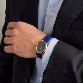 cassa in oro giallo 18kt, fondello a scatto, quadrante blu "sigma", indici applicati, movimento a carica manuale cal 16-250 n.1272708, cinturino originale in pelle di colore blu, fibbia originale in oro giallo, vetro minerale. Dim. mm 30x35