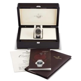 cassa monoblocco in oro bianco 18kt, fondello con movimento a vista, lunetta liscia in oro bianco 18kt, quadrante ardesia con indicazione del datario, riserva di carica e fase lunare, indici applicati, movimento a carica automatica cal. 240 n. 3171146, cinturino in cuoio, chiusura a scomparsa marcata Patek Philippe, vetro minerale, gr. complessivi 143. Diam. mm 40. Corredato di scatola, garanzia e libretti originali.