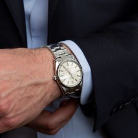 cassa in acciaio, fondello a vite, corona marcata, ghiera liscia in acciaio, quadrante argenté firmato Rolex, indici applicati al trizio, datario a ore tre con lente cyclope, movimento a carica automatica cal 3035 n.1210832, bracciale oyster a maglie piene ref. 78350 finali 557, lungh. interna cm 20 circa, chiusura a scatoletta marcata Rolex, vetro plastica. Diam. mm 34