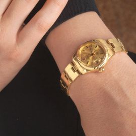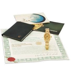 cassa in oro giallo 18kt, fondello a vite, corona marcata, ghiera zigrinata in oro giallo 18kt, quadrante champagne, grafica nera, datario a ore tre con lente cyclope, indici applicati oro e nero, movimento a carica automatica cal 2030 n. 462760, bracciale in oro giallo 18kt, chiusura a scatoletta in oro giallo 18kt firmata Rolex, vetro plastica, gr. 63. Diam. mm 26. Corredato di garanzia e libretti.