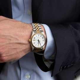 cassa in acciaio, fondello a vite, corona marcata, ghiera zigrinata in oro giallo, quadrante bianco firmato Rolex, grafica nera, datario a ore tre con lente cyclope, numeri romani in nero con trizio, movimento a carica automatica cal 3035 n. 0314549, bracciale jubilee in acciaio e oro ref. 62510H finali 550, cod. produzione E5, lungh. interna cm 20 circa, chiusura a scatoletta in acciaio marcata Rolex, vetro plastica. Diam. mm 36. Corredato di scatola.
