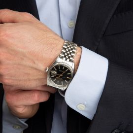 cassa in acciaio, fondello a vite, corona marcata, ghiera zigrinata in acciaio, quadrante nero firmato Rolex, grafica oro, indici applicati al trizio, datario a ore tre con lente cyclope, movimento a carica automatica cal 3035 n. 0329047, bracciale jubilee in acciaio ref. 62510H finali 555, lungh. interna cm 19 circa, chiusura a scatoletta in acciaio marcata Rolex, vetro plastica. Diam. mm 36