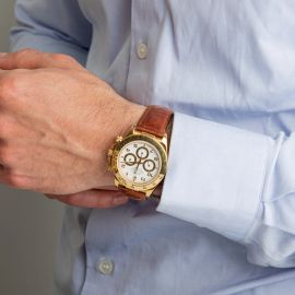 cassa in oro giallo 18kt, fondello a vite, corona marcata e tasti a vite, ghiera con scala tachimetrica a 400, quadrante bianco firmato Rolex, contatori oro, grafica nera, contatore dei secondi a ore nove, contatore dei minuti a ore tre, contatore delle ore alle sei, numeri arabi oro applicati, movimento a carica automatica cal 4030 n. 125518, cinturino originale in pelle marrone, chiusura a scatoletta in oro giallo 18kt ref. 16518 marcata Rolex, vetro minerale, gr. 120. Diam. mm 40. Corredato di scatola, garanzia, secondo cinturino in pelle, accessori e libretti.