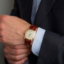 cassa in oro giallo 18kt, fondello a vite, corona marcata, ghiera zigrinata in oro giallo 18kt, quadrante panna firmato Rolex, numeri arabi e indici oro applicati, movimento a carica automatica, cinturino in pelle marrone, fibbia originale placcata in oro, vetro plastica, gr. complessivi 45. Diam. mm 34