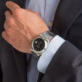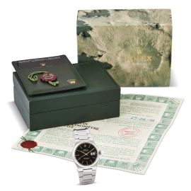 cassa in acciaio, fondello a vite, corona marcata, lunetta liscia in acciaio, quadrante nero firmato Rolex, grafica bianca, indici applicati, datario a ore tre con lente cyclope, movimento al quarzo cal 5035 n. 0109770, bracciale oysterquartz in acciaio ref. 17000B, lungh. interna cm 19 circa, chiusura a scatoletta firmata Rolex, vetro zaffiro. Diam. mm 36. Corredato di scatola e garanzia.