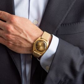 cassa in oro giallo 18kt lucido e satinato, fondello a pressione, lunetta a scalino, corona marcata, quadrante "chocolate" firmato Zenith, grafica nera, indici applicati, datario tra ore quattro e ore cinque, movimento a carica automatica cal 408, cinturino in pelle beige, fibbia in acciaio dorato, vetro plastica bombato, gr. complessivi 36. Diam. mm 36