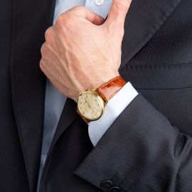 cassa in oro giallo 18kt, fondello a pressione, tasti cronografo di forma rettangolare, quadrante argenté, due contatori, numeri arabi applicati color oro, movimento a carica manuale cal 143, cinturino in pelle marrone originale, fibbia in metallo dorato firmata Zenith, vetro plastica, gr. complessivi 45. Diam. mm 36