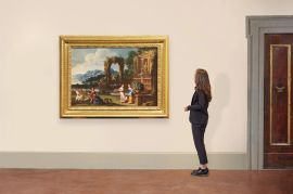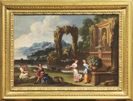 FIGURES IN A GARDEN WITH FOUNTAINS