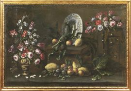 NATURA MORTA CON VASI DI FIORI, LIMONI E PIATTO IN CERAMICA