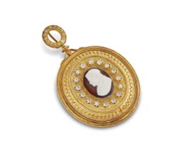 in oro inciso e in filigrana, con al centro un cammeo in corniola raffigurante Sua Santità Papa Pio IX, circondato da una fila di pietre incolore e ghirlande stilizzate a rilievo, reca sul retro inciso lo stemma della famiglia Mastai Ferretti a cui apparteneva sua Santità, mm 90X68, gr 105. Corredato di cartiglio in cui viene riportato come segue: "regalato da S. Santità Pio IX alla Contessa Giulia Guicciardini Pucci, nell'occasione della sosta che fece Santità Sua il 18 Agosto 1857 nella Villa Guicciardini a Montughi."
