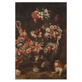 Compagno della tela qui al lotto precedente, il dipinto qui offerto ne differisce per essere esclusivamente dedicato alla raffigurazione di fiori variopinti tra cui prevalgono anemoni e tulipani presentati all’aperto, disposti in vasi diversi tra loro per genere e dimensioni: si va dal vaso di terracotta tipicamente da giardino in cui fioriscono anemoni, ai vasi d’argento diversi per foggia e lavorazione, tipici della produzione di Abraham Brueghel. Anche questo un motivo importato da Roma, e ripreso a Napoli fino al Settecento inoltrato da Nicola Malinconico e Andrea Belvedere.