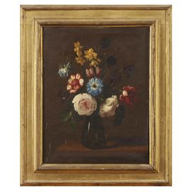 Austero nell’impaginazione e insieme attento alla resa dei riflessi e delle ombre, il dipinto si lega alla serie di quattro piccole tele – vicine a questa per dimensioni e anch’esse provenienti da una raccolta fiorentina – pubblicate da Silvia Proni, cui si deve la prima e più esaustiva ricognizione della famiglia Stanchi (in G. e U. Bocchi, Pittori di natura morta a Roma. Artisti italiani 1630 – 1750, Casalmaggiore 2006, p- 254, figg. FS.8-11). Anche nei dipinti citati i fiori appaiono raccolti in semplici vasi di vetro – uno di essi in tutto uguale al nostro – poggiati su un piano di legno su cui proiettano l’ombra. Altri confronti devono stabilirsi con i tre dipinti su ardesia esposti a Firenze e a Monaco in occasione della grande rassegna curata nel 2002 da Mina Gregori (Natura morta italiana tra Cinquecento e Seicento. Catalogo della mostra, Milano 2002, pp. 234-35).