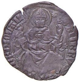 Ar gr. 2,55 D/ Scudo, elmo e cimiero tra tizzoni e secchie in cornice R/ Santo benedicente in trono MIR 108 Crippa 2