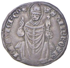 Ar gr. 2,70 D/ Scudo, elmo e cimiero con biscia viscontea R/ Santo benedicente in trono MIR 95 Crippa 2