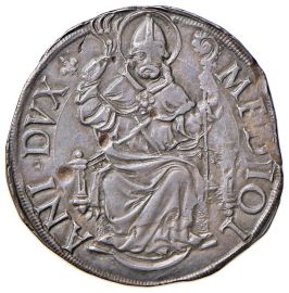 Ar gr. 9,64 D/ Stemma con tre gigli coronato accantonato ai lati da gigli R/ Santo seduto con staffile e pastorale MIR 237 Crippa 4