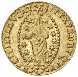 Au gr. 3,49 D/ San Marco porge il vessillo al Doge genuflesso R/ Il Redentore entro un’aureola ellittica stellata Mont. 647 Paol. 1 Fr. 1263
