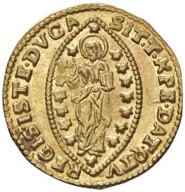 Au gr. 3,47 D/ San Marco porge il vessillo al Doge genuflesso R/ Il Redentore entro un’aureola ellittica stellata Mont. 2229 Paol. 1 Fr. 1358