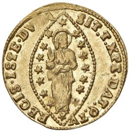 Au gr. 3,46 D/ San Marco porge il vessillo al Doge genuflesso R/ Il Redentore entro un’aureola ellittica stellata Mont. 2734 Paol. 1 Fr. 1404