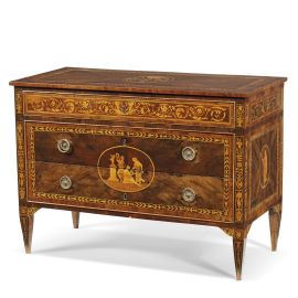 in legni intarsiati, piano profilato da motivo a racemi inquadrante medaglione con vaso di fiori tra elementi vegetali, sotteso da cassetto interamente lavorato a girali continui sormontante due cassetti inquadrati da cornice a fogliette intervallate a fiori e adornati al centro con medaglione raffigurante scena di gusto neoclassico che si ripete sui lati, quattro maniglie tonde cesellate a elementi vegetali, lesene angolari intarsiate a candelabre che proseguono a formare le gambe troncopiramidali, cm 88,5x123x58