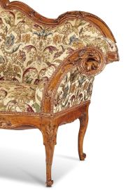 a orecchioni in noce intagliato, seduta e schienale rivestiti in importante tessuto in seta a fondo avorio ricamata a fiori tra nastri, schienale di linea sagomata a racemi fogliacei che si dipartono da cornucopie poste ai lati a formare al centro motivo rocaille a giorno, braccioli a ricciolo intagliati a ramo di foglie arricciato, grembiale mosso tripartito da otto gambe mosse terminanti su piedi a ricciolo e profilato da volute a inquadrare ai centri cartelle tra volute, cm 118x245x73