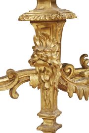 in legno intagliato e dorato, piano in marmo giallo di Siena di linea mossa, sotteso da fascia impreziosita da rosette e centrata da mascherone da cui si dipartono racemi, su quattro gambe troncopiramidali riccamente scolpite con protomi ferine e riunite da traverse decorate a volute e racemi, cm 95x242x88