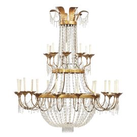 in metallo dorato e cristallo, a due ordini, quello inferiore a diciotto bracci e quello superiore a nove bracci per un totale di ventisette luci, i bracci ornati da pendenti e collane in cristallo che si dipartono da fasce in bronzo cesellato a motivi vegetali, i palchi ornati da pendenti che discendono verticalmente dalla cima ornata in foggia di corona di foglie, anch'esse riunite dal pendenti in cristallo, a formare il motivo a mongolfiera nella parte sottostante, montato a elettricità, alt. cm 181, diam. cm 158