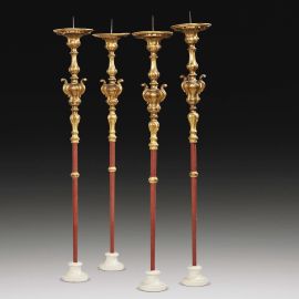 in legno intagliato laccato e dorato, grande piattello dorato di forma circolare sormonta sostegno in foggia di pera che continua in elemento tornito a cartella e arricchito da elementi fogliacei raffigurante calice ed ostia su ogni lato su stelo laccato di colore rosso poggiante su sostegno marmoreo bianco, alt. cm 225