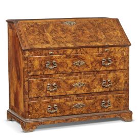 interamente lastronata in radica, ribalta celante vano a giorno centrale inquadrato da un vano a giorno sormontato da cassetto su ogni lato, e sottesa da tre ordini di cassetti con bocchette e maniglie in bronzo, base con piedi a mensola, cm 111x123,5x59