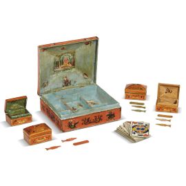 in legno laccato decorato ad arte povera con veduta di castello al centro del coperchio tra girali, interno analogamente ornato ad arte povera suddiviso in cinque scomparti con carte da gioco e quattro scatoline contenenti fiches, cm 9,5x19,8x17