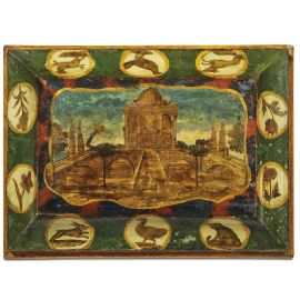 in legno laccato con decori ad arte povera, coperchio ornato al centro da veduta di città entro riserva sagomata inquadrato da medaglioni con animali e fiori, corpo analogamente ornato con vedute di città ai centri inquadrati da personaggi a cavallo, piedi a mensola, cm 11x22,5x17