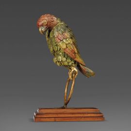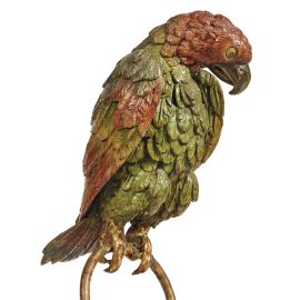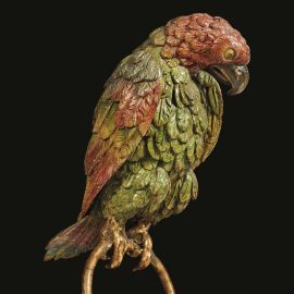 in legno dipinto in policromia raffigurante pappagallo su anello, su base in legno modanato, cm 54x20,7x34,4
