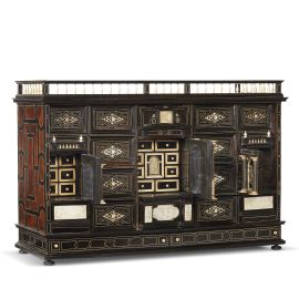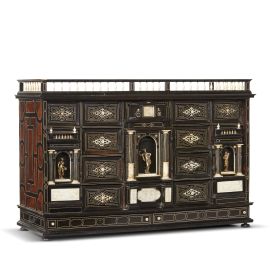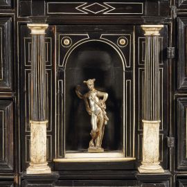 in ebano ed osso, di forma architettonica con coronamento a ringhierina, nella nicchia centrale una statuetta di Hermes, sormontata e sottesa da sportellini celati ed intervallata da cinque cassettini su ogni lato, decorati con motivo a losanga in osso, e celanti otto cassettini attorno ad uno sportellino estraibile; le due nicchie laterali con allegorie delle stagioni sono sormontate da un cassettino ciascuna e celano sei cassettini, sotto le nicchie varie decorazione in osso; i fianchi realizzati a motivi geometrici in ebano e palissandro, base con due sottili cassettini, piedini a sfera schiacciata, cm 74x112x41 cm