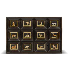 in legno ebanizzato, fronte a sei cassetti disposti su due colonne ciascuno dei quali ornato da due formelle in pietre policrome a raffigurare animali entro cornici modanate, cm 62,7x95,5x37, completo di base a un cassetto sottopiano, cm 74,5x95,5x41,5