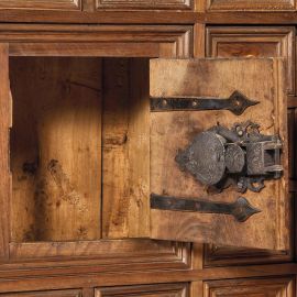 in noce, fronte a uno sportello sformellato celante cassaforte centrale tra diciotto cassettini, inquadrato agli angoli da festoni che si dipartono da mascheroni e coronato da volute a inquadrare al centro cartella, angoli posteriori scolpiti ad ampia voluta ornata da festone, base modanata su piedi a zampa ferina, cm 124x110x44, completo di tavolino con gambe tornite riunite da traverse in ferro, cm 78x99,5x38,7
