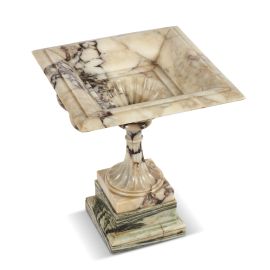 in marmo fior di pesco bianco, di forma quadrangolare dai bordi estroflessi, sorretta da stelo scanalato e terminante in motivo a conchiglia unito da quattro sostegni ricurvi, cm 43,5x36x36