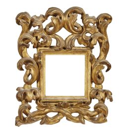 in legno intagliato e dorato, battuta a gola si porta su più ordini di piccole modanature terminati in fascia interamente contornata da intaglio a giorno di volute riunito alla base da cornucopie incrociate sotto foglie aperte; ingombro cm 33,5x28,8, luce cm 11,6x11,4