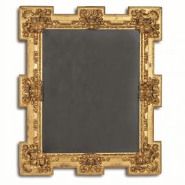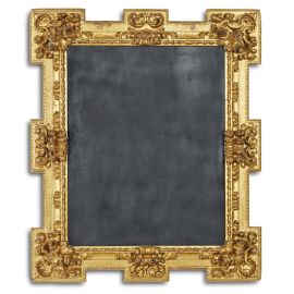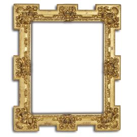 in legno intagliato e dorato, battuta liscia con controbattuta a fogliette ricorrenti intervallate ai centri e agli angoli da foglie accartocciate, fascia intagliata a fogliette di acanto si porta su sagoma con fondo inciso a piccoli motivi geometrici con angoli e centri scantonati intagliati da decori vegetali a rilievo, fascia baccellata scende a muro, montate a specchio; ingombro cm 150,5x127,5, luce cm 109x85,8