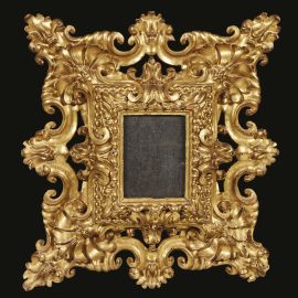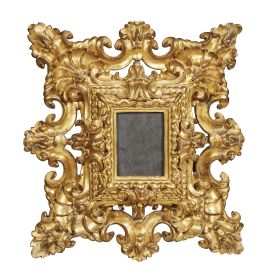 in legno intagliato e dorato, battuta a gola si porta su fascia baccellata e angoli prominenti sopra perlinatura, il tutto racchiuso da racemi ai centri che si sviluppano in intaglio a giorno di forma sagomata con duplice fascia a ventaglio di foglie aperte agli angoli, montate a specchio; ingombro cm 43x39,5, luce cm 11,2x8,3 e 12,6x9,3