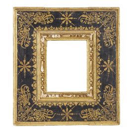 in legno ebanizzato, intagliato e dorato, battuta a gola si porta su fascia aggettante con motivo a perline e fusarole che ricade in più ordini di modanature in sagoma liscia interamente decorata a ramages e rosette ai centri, modanatura dorata si porta a muro, montate a specchio; ingombro cm 38x34,2, luce cm 16,2x12,6