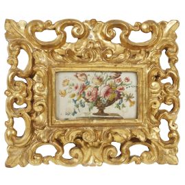 in legno intagliato e dorato, battuta a gola si porta su fascia aggettante intagliata a racemi che si adagia su intaglio a giorno analogamente lavorato a ramages a volute e a fiorellini aperti agli angoli lungo tutto il perimetro, contengono tempere su pergamene raffiguranti vasi di fiori, montate a vetro; ingombro cm 22,4x27, luce cm 7,2x12,6